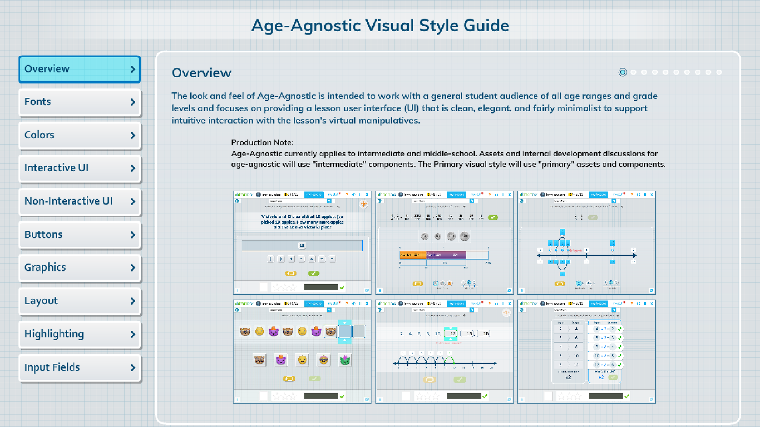 As all lessons were eventually made available for all groups (3rd graders potentially advancing to 7th-grade math and 8th graders needing to play 2nd grade math lessons), I proposed and designed an Age-Agnostic Lesson UI system with a clean minimalist approach for maximum flexibility, visual consistency, and scalability. This approach was also intended to mitigate the issue of older students not appearing to be playing the ‘babyish-looking’ lessons in their classroom if they were assigned earlier grade-level lessons.